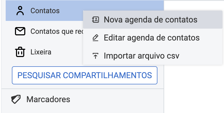 Esses não podem ser renomeados ou apagados, mas você pode criar novos livros de endereço para organizar melhor seus contatos. Para criar um novo livro de endereços, posicione-se em Contatos e clique com o botão de menu, logo clique em Nova agenda de contatos: