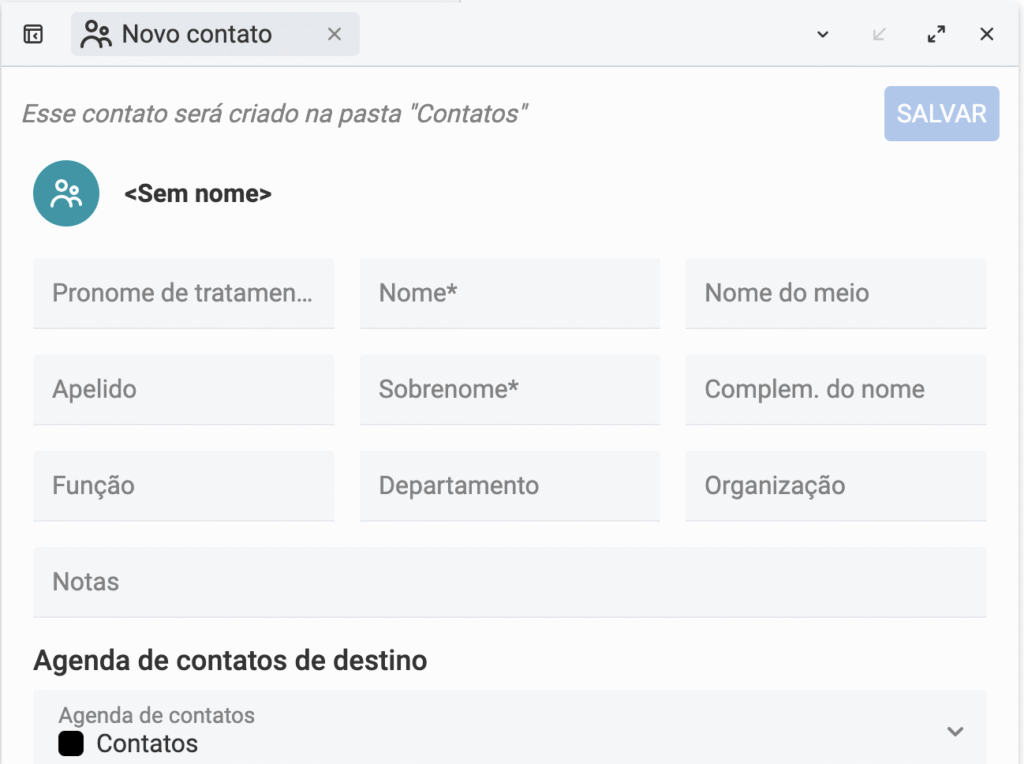 Para criar um novo contato, clique no botão Novo na barra superior. Se abrirá uma janela onde poderá completar todos os detalhes desejados: